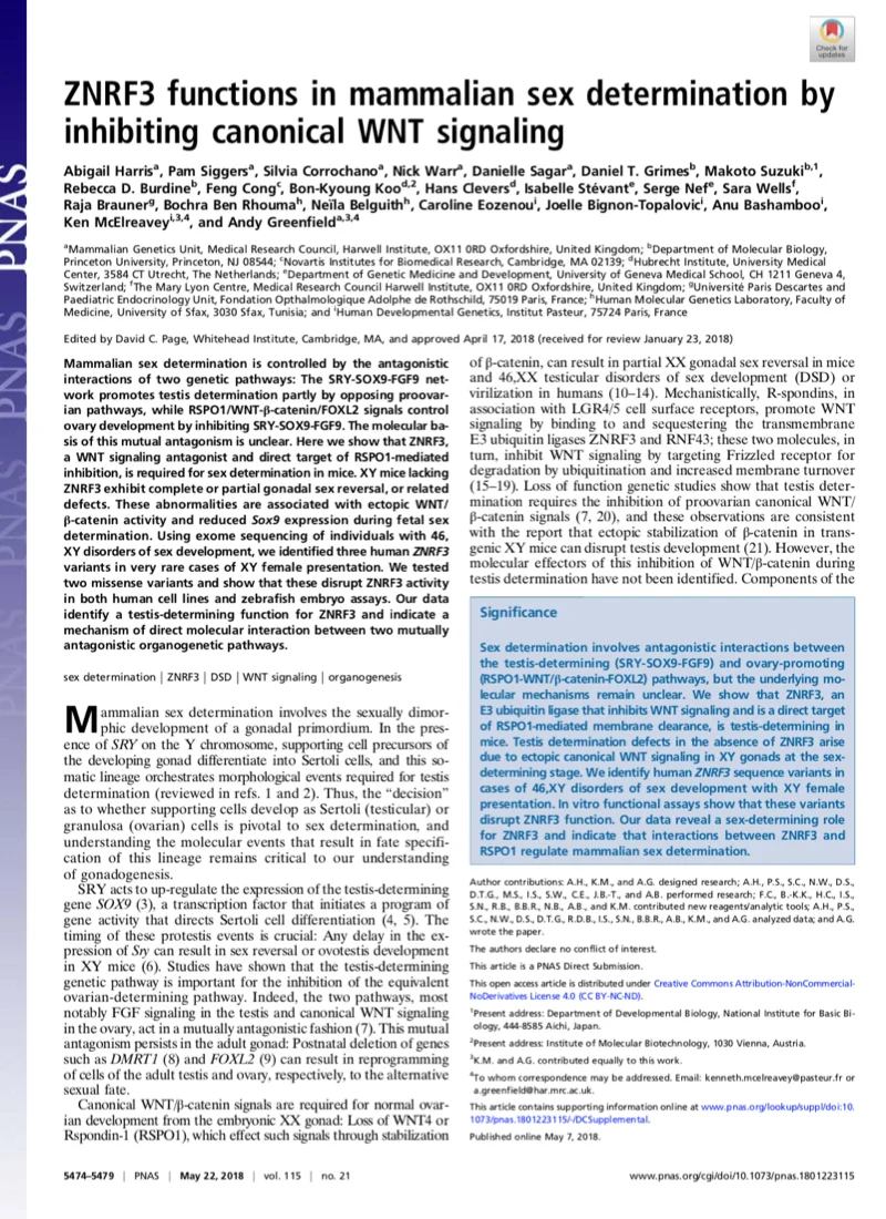 A Harris, P Siggers, S Corrochano, N Warr, D Sagar, DT Grimes, M Suzuki, RD Burdine, F Cong, B-K Koo, H Clevers, I Stevant, S Nef, S Wells, R Brauner, BB Rhouma, N Belguith, C Eozenou, J Bignon-Topalovic, A Bashamboo, K McElreavey#, Greenfield A#