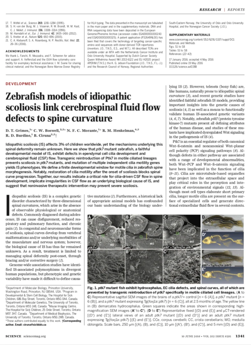 Zebrafish models of idiopathic scoliosis link cerebrospinal fluid flow defects to spine curvature